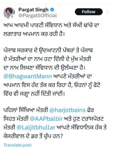 ਪਰਗਟ ਸਿੰਘ ਨੇ ਟਵੀਟ ਕਰਕੇ ਕਿਹਾ…ਆਮ ਆਦਮੀ ਪਾਰਟੀ ਸੰਵਿਧਾਨ ਤੇ ਸੰਘੀ ਢਾਂਚੇ ਦਾ ਲਗਾਤਾਰ ਅਪਮਾਨ ਕਰ ਰਹੀ ਹੈ। ਪੰਜਾਬ ਸਰਕਾਰ ਦੇ ਉਦਘਾਟਨੀ ਪੱਥਰਾਂ ਤੇ ਪੰਜਾਬ ਦੇ ਮੰਤਰੀਆਂ ਦਾ ਨਾਮ ਹਟਾ ਦਿੱਲੀ ਦੇ ਮੁੱਖ ਮੰਤਰੀ ਦਾ ਨਾਮ ਲਿਖਣਾ ਸੰਵਿਧਾਨ ਦੀ ਉਲੰਘਣਾ ਹੈ।