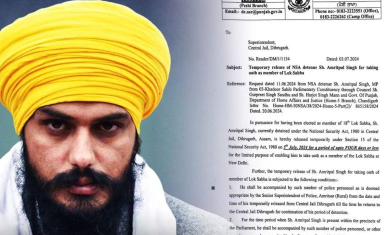 ਅੰਮ੍ਰਿਤਪਾਲ ਸਿੰਘ ਨੂੰ ਕੁਝ ਸ਼ਰਤਾਂ ਦੇ ਆਧਾਰ ਤੇ ਦਿੱਤੀ ਗਈ ਪੈਰੋਲ