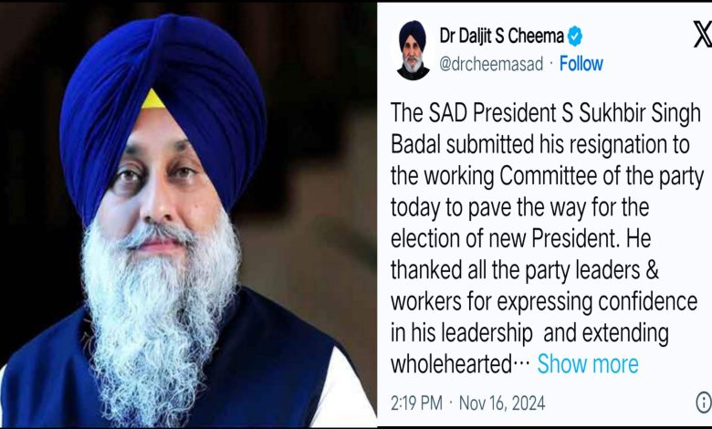 ਸੁਖਬੀਰ ਬਾਦਲ ਨੇ ਛੱਡੀ ਅਕਾਲੀ ਦਲ ਦੀ ਪ੍ਰਧਾਨਗੀ, ਸੀਨੀਅਰ ਆਗੂ ਦਲਜੀਤ ਚੀਮਾ ਨੇ ਕੀਤੀ ਪੁਸ਼ਟੀ