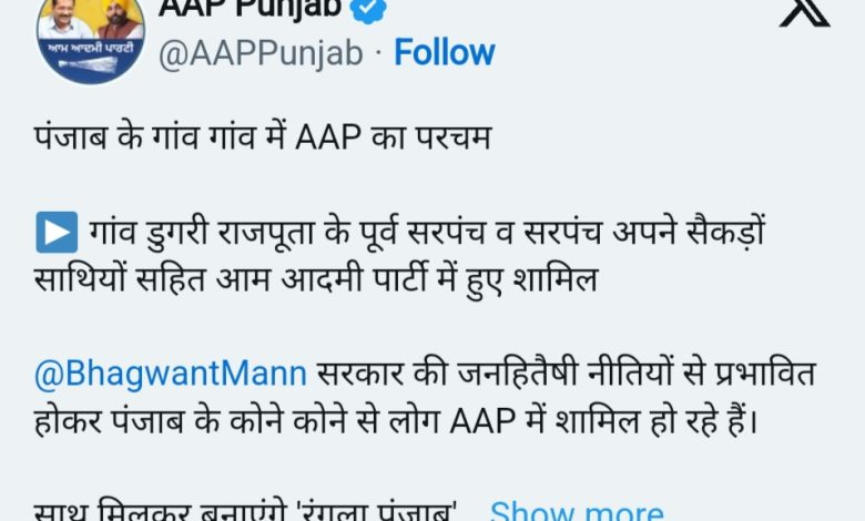 ਪੰਜਾਬ ਸਰਕਾਰ ਵੱਲੋਂ ਸ਼ੁੱਕਰਵਾਰ ਨੂੰ ਪੰਚਾਇਤੀ ਚੋਣਾਂ ਦੀਆਂ ਤਰੀਕਾਂ ਦਾ ਐਲਾਨ ਕਰ ਦਿੱਤਾ ਗਿਆ ਹੈ ਅਤੇ ਸੂਬੇ ਦੀਆਂ ਸਾਰੀਆਂ ਗ੍ਰਾਮ ਪੰਚਾਇਤਾਂ, ਜ਼ਿਲ੍ਹਾ ਪ੍ਰੀਸ਼ਦਾਂ ਅਤੇ ਪੰਚਾਇਤ ਸੰਮਤੀਆਂ ਨੂੰ ਭੰਗ ਕਰ ਦਿੱਤਾ ਗਿਆ ਹੈ, ਜਿਸ ਤੋਂ ਬਾਅਦ ਪਿੰਡਾਂ ਵਿੱਚ ਦਲ-ਬਦਲੀ ਦੀ ਖੇਡ ਸ਼ੁਰੂ ਹੋ ਗਈ ਹੈ। ਆਪ’ ਪੰਜਾਬ ਦੇ ਟਵੀਟ ਅਕਾਊਂਟ ਤੋਂ ਇੱਕ ਪੋਸਟ ਸ਼ੇਅਰ ਕੀਤੀ ਗਈ ਹੈ, ਜਿਸ ‘ਤੇ ਲਿਖਿਆ ਗਿਆ ਹੈ ਕਿ ਸਾਬਕਾ ਸਰਪੰਚ ਤੇ ਪਿੰਡ ਦੁੱਗਰੀ ਰਾਜਪੂਤਾ ਦੇ ਸਰਪੰਚ ਆਪਣੇ ਸੈਂਕੜੇ ਸਾਥੀਆਂ ਸਮੇਤ ਆਮ ਆਦਮੀ ਪਾਰਟੀ ‘ਚ ਸ਼ਾਮਲ ਹੋ ਗਏ ਹਨ।ਅੱਗੇ ਲਿਖਿਆ ਹੈ ਕਿ ਭਗਵੰਤ ਮਾਨ ਸਰਕਾਰ ਦੀਆਂ ਲੋਕ ਪੱਖੀ ਨੀਤੀਆਂ ਤੋਂ ਪ੍ਰਭਾਵਿਤ ਹੋ ਕੇ ਪੰਜਾਬ ਦੇ ਕੋਨੇ-ਕੋਨੇ ਤੋਂ ਲੋਕ ‘ਆਪ’ ਵਿੱਚ ਸ਼ਾਮਲ ਹੋ ਰਹੇ ਹਨ। ਅਸੀਂ ਮਿਲ ਕੇ ‘ਰੰਗਲਾ ਪੰਜਾਬ’ ਬਣਾਵਾਂਗੇ। ਪਰ ਸੂਤਰਾਂ ਦੀ ਮੰਨੀਏ ਤਾਂ ਰਵਾਇਤੀ ਪਾਰਟੀਆਂ ਦੇ ਬਹੁਤ ਸਾਰੇ ਪੰਚ ਸਰਪੰਚ ਆਮ ਆਦਮੀ ਪਾਰਟੀ ਚ ਸਰਪੰਚੀ ਲੈਣ ਦੇ ਮਕਸਦ ਨਾਲ ਆਮ ਆਦਮੀ ਪਾਰਟੀ ਚ ਸ਼ਾਮਿਲ ਹੋਣ ਦੀਆਂ ਵਿਊਤਾਂ ਬਣਾ ਰਹੇ ਹਨ